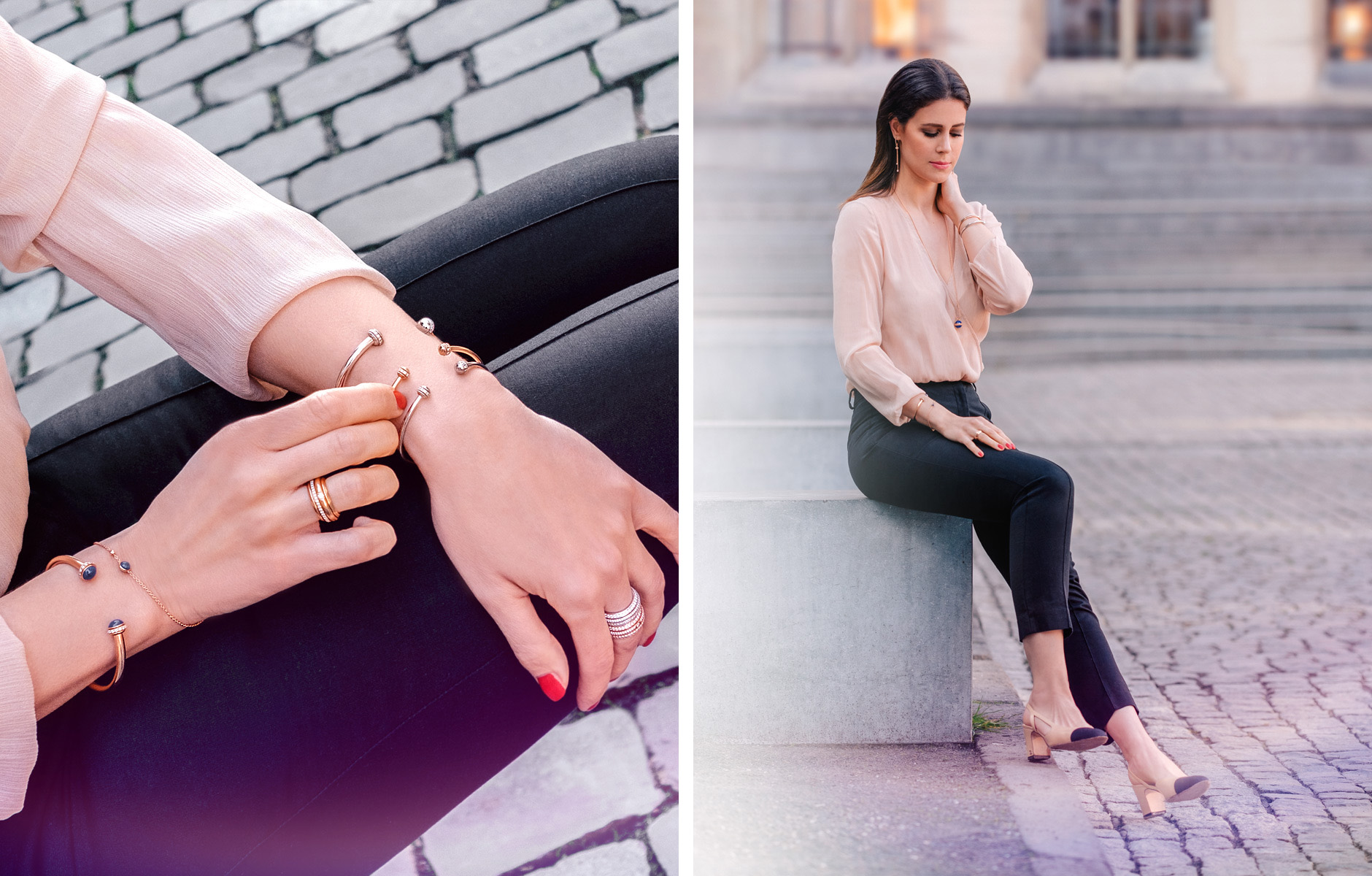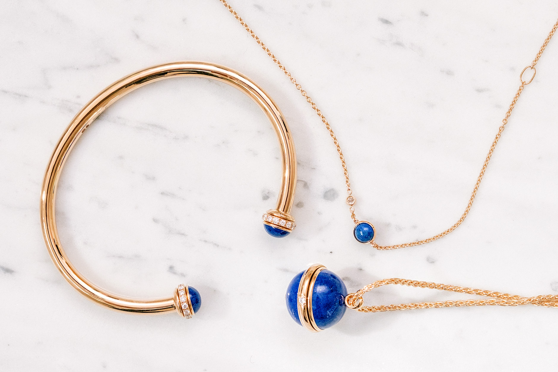 Das Zusammenspiel von Diamanten und dem tiefblauen Lapis-Lazuli ist dezent und in Verbindung mit dem warmen Roségoldton sehr gelungen. Meine absoluten Favoriten sind die Armreifen, die wunderbar miteinander harmonieren und sich sehr gut kombinieren lassen. Aber auch die Kette mit dem großen runden Anhänger ist ein Highlight der Kollektion, denn diese läßt sich entweder lang und tief im Ausschnitt tragen, kann aber auch verkürzt werden, indem sie doppelt um den Hals gelegt wird (zu sehen bei Olivia Palermo).