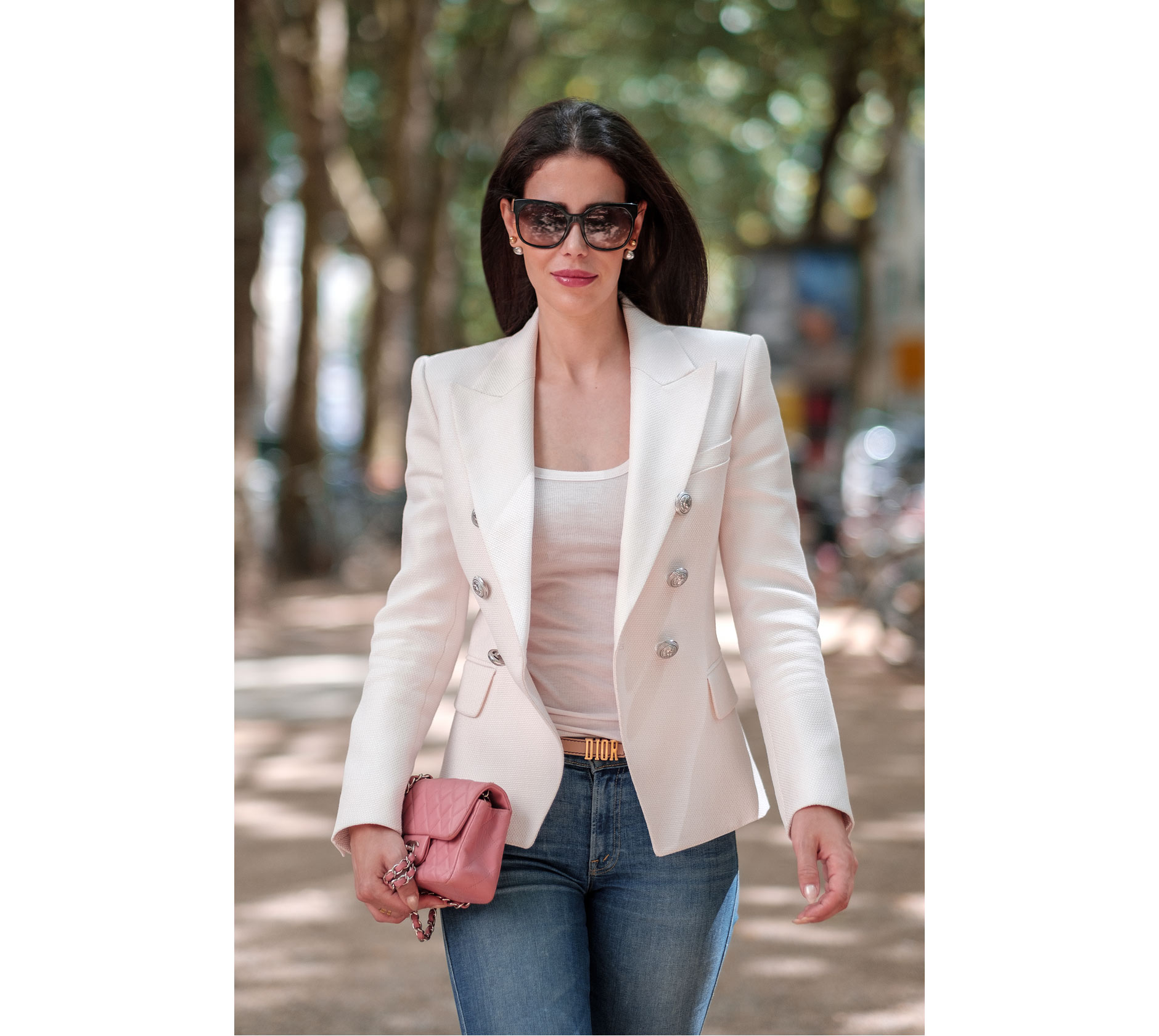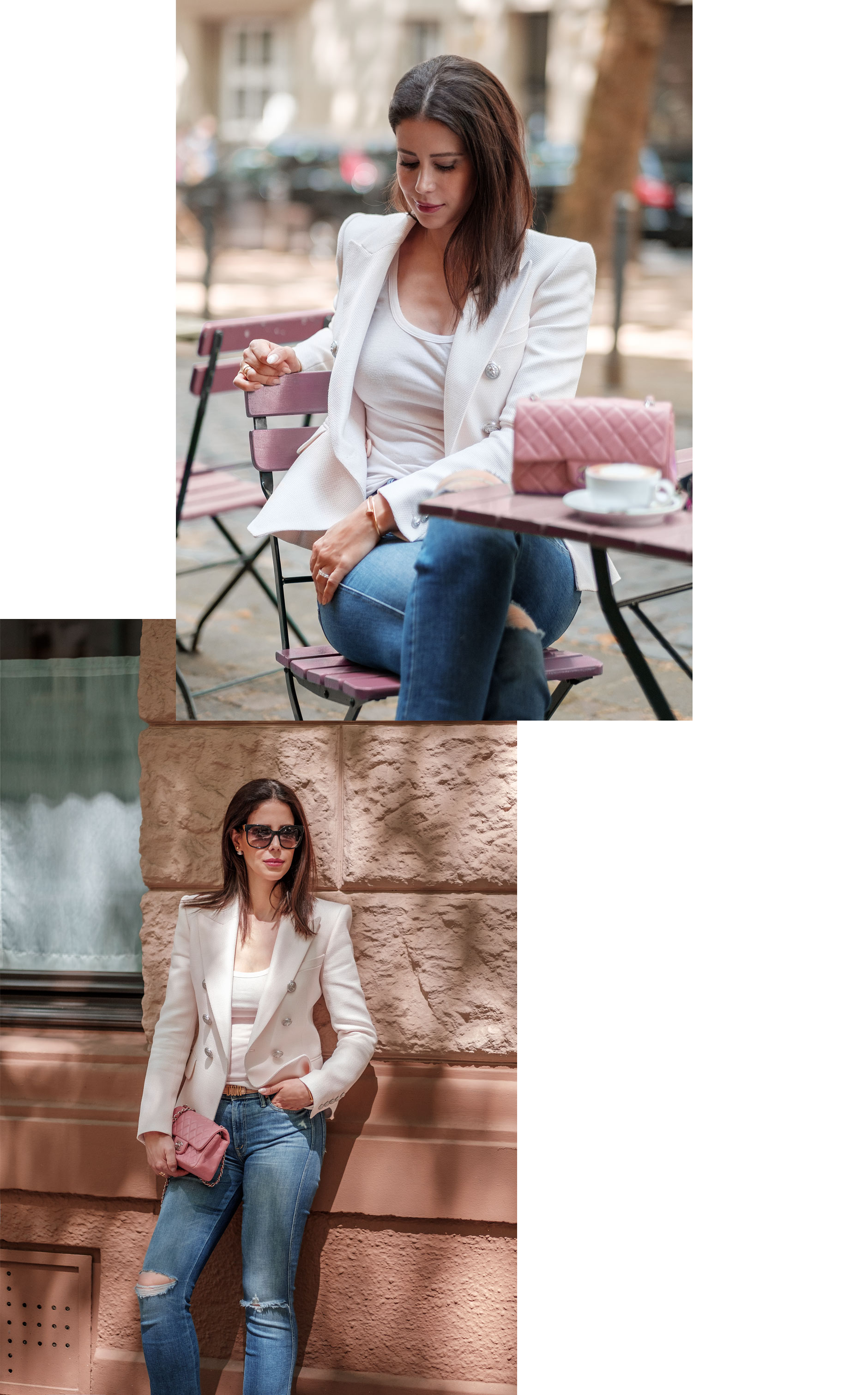 Obwohl ich eine recht große Sammlung von Mänteln besitze (die im Sommer natürlich nicht zum Einsatz kommen), und ich auch bei in Sachen Parka/Jeansjacke/Trenchcoat ganz gut ausgestattet bin, hatte ich in letzter Zeit das Gefühl, dass mir in meiner Garderobe eine hellere Sommerjacke fehlt. Und so hat es mich auf der Suche nach einem neuen Blazer in einer neutralen Farbe irgendwann auf die Seite von Balmain verschlagen. Da ich bereits seit einem Jahr den schwarzen Klassiker besitze und diesen auch wirklich oft und gerne trage, habe ich mich sehr gefreut, das pastellrosane Pendant nun im Sale gefunden zu haben. Der sehr helle Rosaton läßt sich wunderbar zu Jeans, Kleidern und Röcken kombinieren und fungiert gleichzeitig als ideale Jacke für kühle Sommerabende.