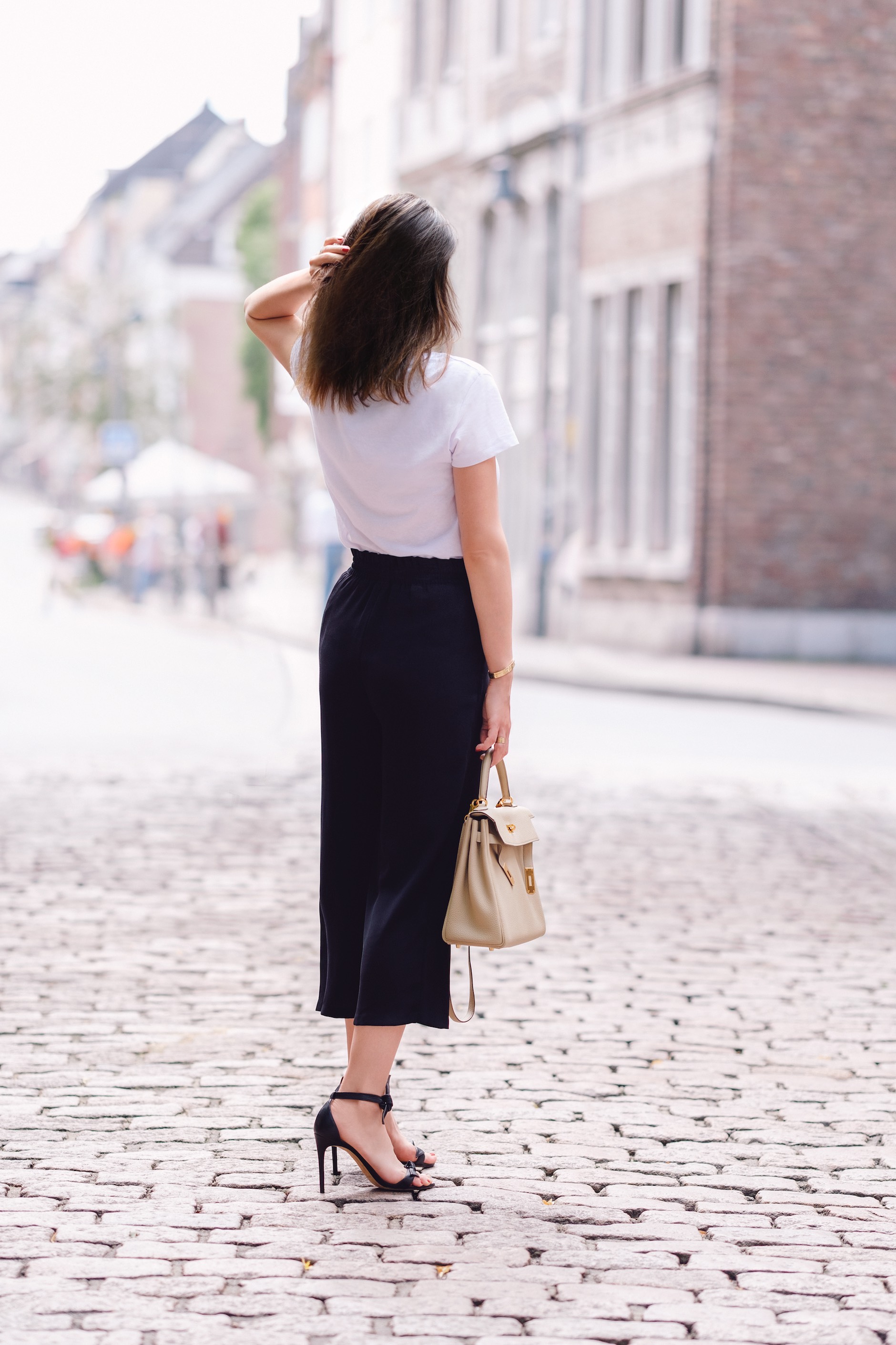 Ein weißes T-Shirts ist ein Kleidungsstück, das sich meiner Meinung nach so gut wie kein zweites kombinieren läßt. So läßt es sich wunderbar in Verbindung zu Blue Jeans und Sneakers, aber gleichermaßen auch zu Röcken und High Heels bzw. einer schlichten schwarzen Hose und Sandalen tragen. Und so gibt es heute ohne viele Worte ein Outfit mit meinem aktuellen Lieblingsshirt und einer schwarzen Culotte von Zara, die ich vor ein paar Wochen gekauft habe und seitdem schon unheimlich oft getragen habe.