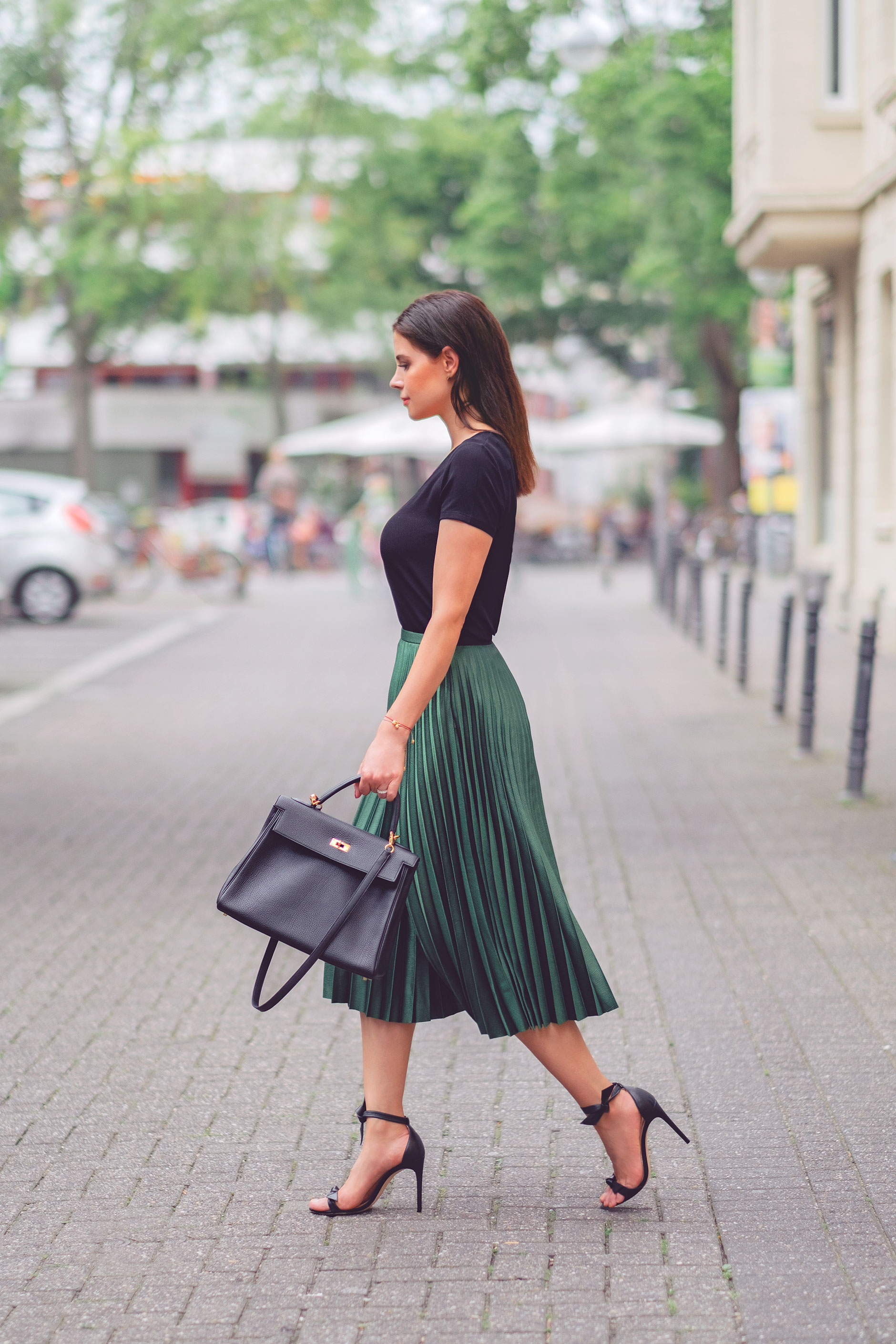 Bevor es diese Woche mit dem Herbst so richtig losgegangen ist, haben wir an einem der letzten Sommer-/Sonnentage noch dieses Outfit fotografiert. Der grüne Faltenrock, den ich bei Zara gefunden habe, läßt sich sehr schön mit schwarzen Accesoires und einem schlichten T-Shirt kombinieren (obwohl ich mir hierzu auch ein Cropped Top gut vorstellen könnte, aber davon gab es hier in letzter Zeit schon genug :-)).